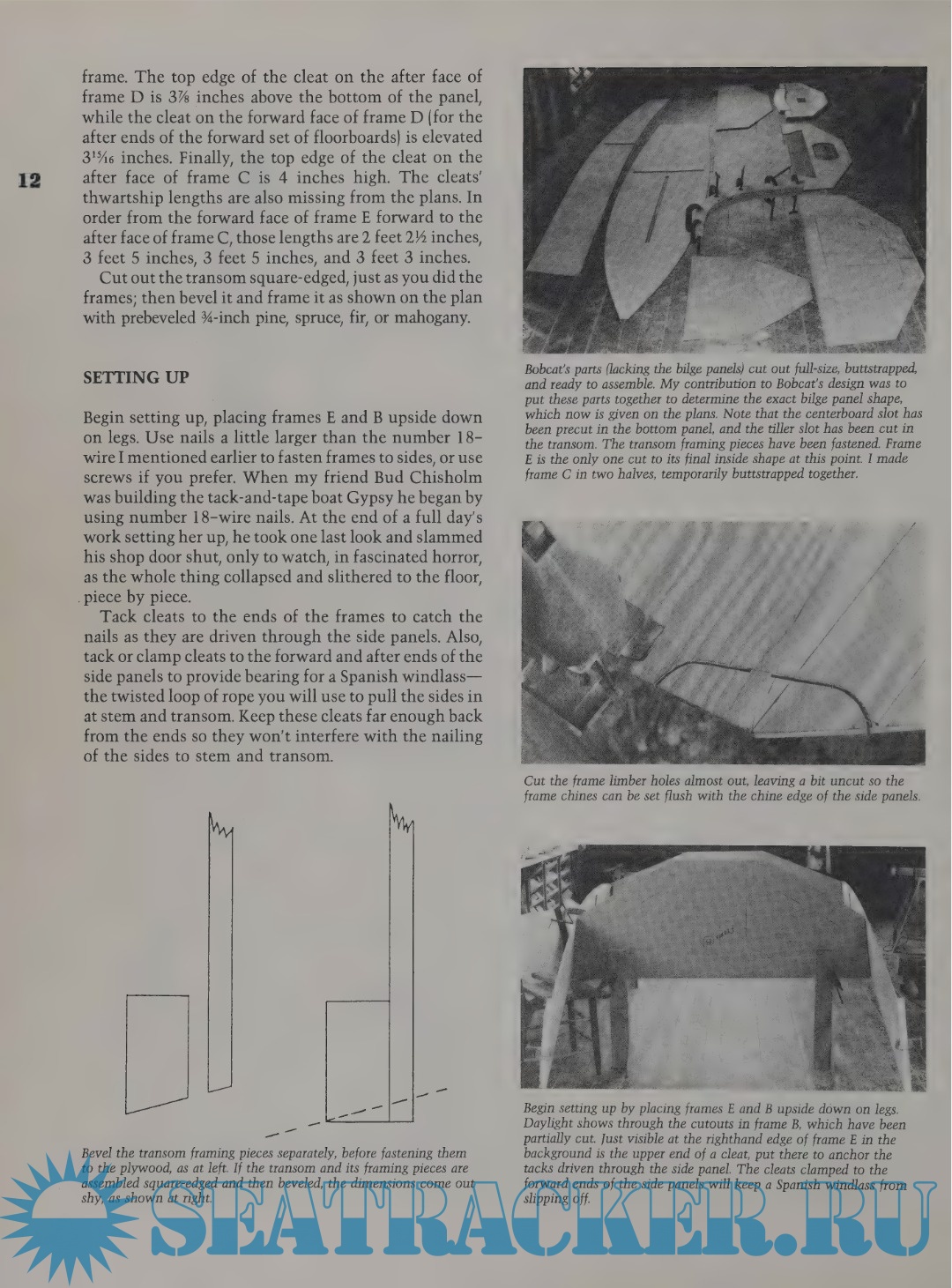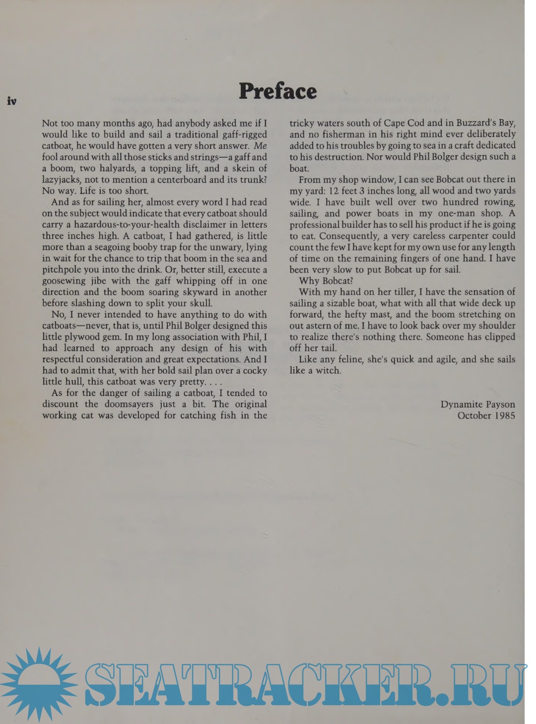 Year: 1986 Language: English Author: Harold Payson Genre: Instruments, Boatbuilding, Woodworking Publisher: International Marine Publishing Company Camden, Maine 04843 ISBN: 0-87742-222-2 Format: PDF Quality: Scanned pages + text layer Pages count: 52 Description: Sorpe years ago, downeast boatbuilder Harcfld H. Payson — known to associates, friends, and his wife as Dynamite — and Philip Bolger of Gloucester, Massachusetts — arguably the most innovative small-craft designer around — got their heads together and came up with a new and startling idea: Instant Boats. Bolger began designing a series of bdats that would require no lofting, no jigs, and no exotic tools, skills, or materials. Boats that would not require a great investment of time to cut out and button up. In short, boats for the inexperienced builder whose fundamental desire is to get out on the water. Payson, for his part, builds and thoroughly tests a prototype of each design to wring out every' bug before offering the plans for sale. The original fleet of six boats was described in Dynamite’s book Instant Boats. Thete followed Build the New Instant Boats, presenting eleven more designs, including three shapely and spritely “tack-and-tape” boats. The verdict is in: thousands of amateur builders, have found that the Instant Boats make enjoyable and manageable backyard or basement projects and offer just about the least expensive boating available anywhere. You need not be driven by lack of tools, materials, skills, or time to abandon in frustration a project you conceived in a spirit of pleasurable anticipation. Here is the Instant Catboat. Her easy grace and spirited performance belie her humble components. She is at home in fresh water or salt. Dynamite prefers she be built of marine plywood (sources for which are given), though exterior-grade is acceptable. With marine ply and a loft-made sail, her materials will cost about $1,000. Given her looks and performance, a better bargain is hard to imagine. She is more complex than the other Instant Boats, but nevertheless far simpler to build than most other boats her size. The set of large-scale plans that Dynamite sells mailorder for $35.00 can save eyestrain and time, but she can be built right from this book. Either way, your efforts will be amply rewarded.
