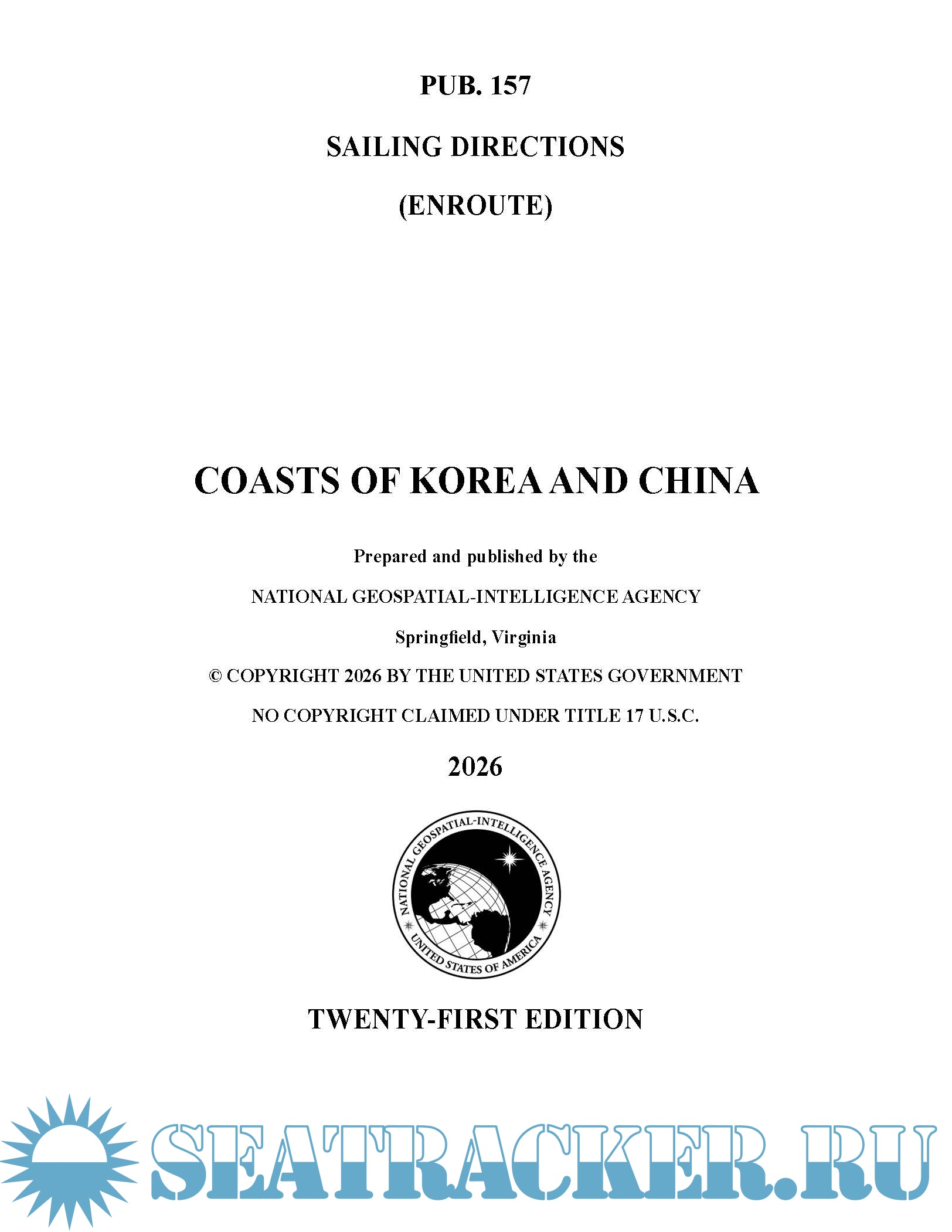 Description: Pub. 157, Sailing Directions (Enroute) Coasts of Korea and China, Twenty-first Edition, 2026, is issued for use in conjunction with Pub. 120, Sailing Directions (Planning Guide) Pacific Ocean and Southeast Asia. Companion volumes are Pubs. 154, 155, 158, and 159.