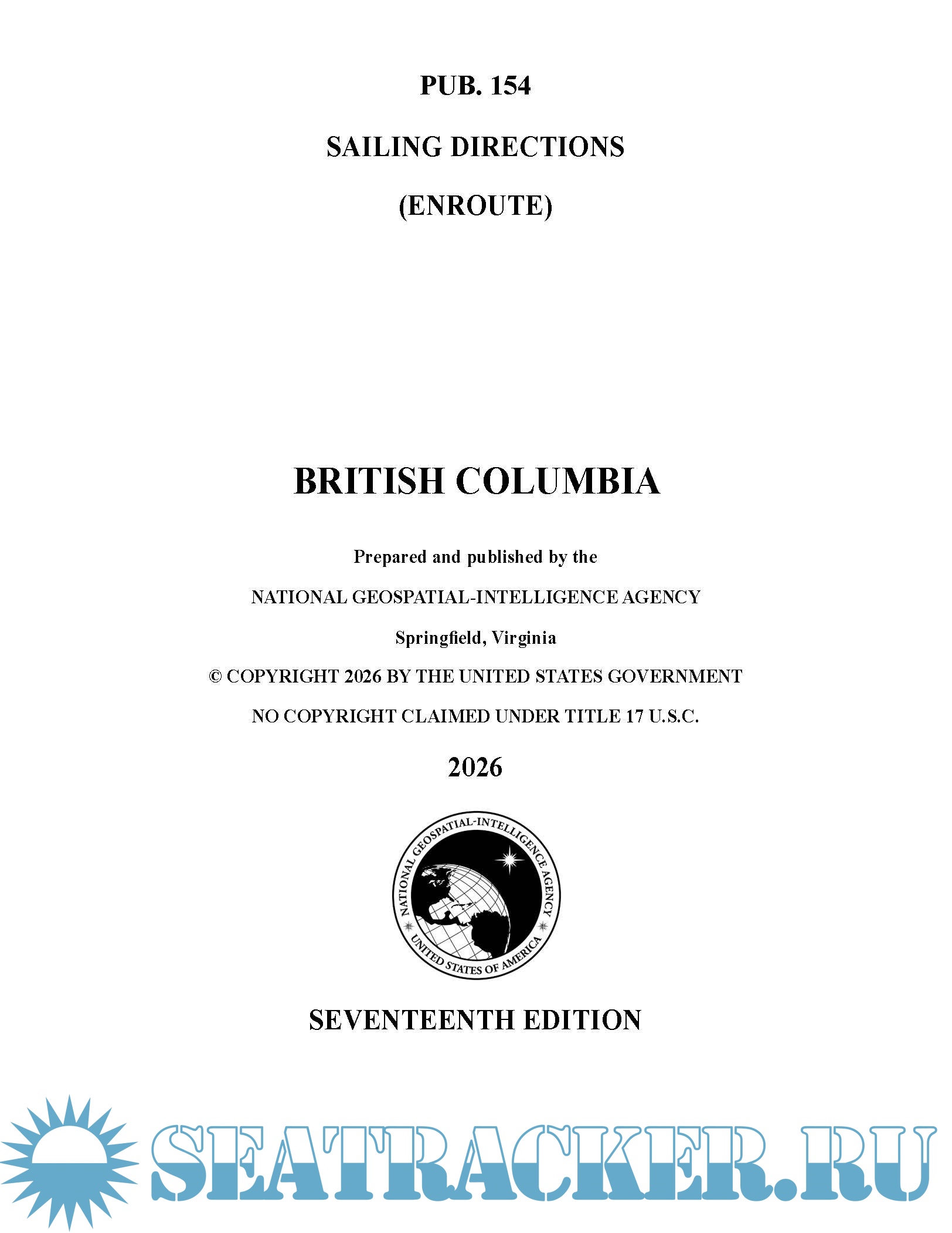 Description: Pub. 154, Sailing Directions (Enroute) British Columbia, Seventeenth Edition, 2026, is issued for use in conjunction with Pub. 120, Sailing Directions (Planning Guide) Pacific Ocean and Southeast Asia. Companion volumes are Pubs. 153, 155, 156, 157, and 158.