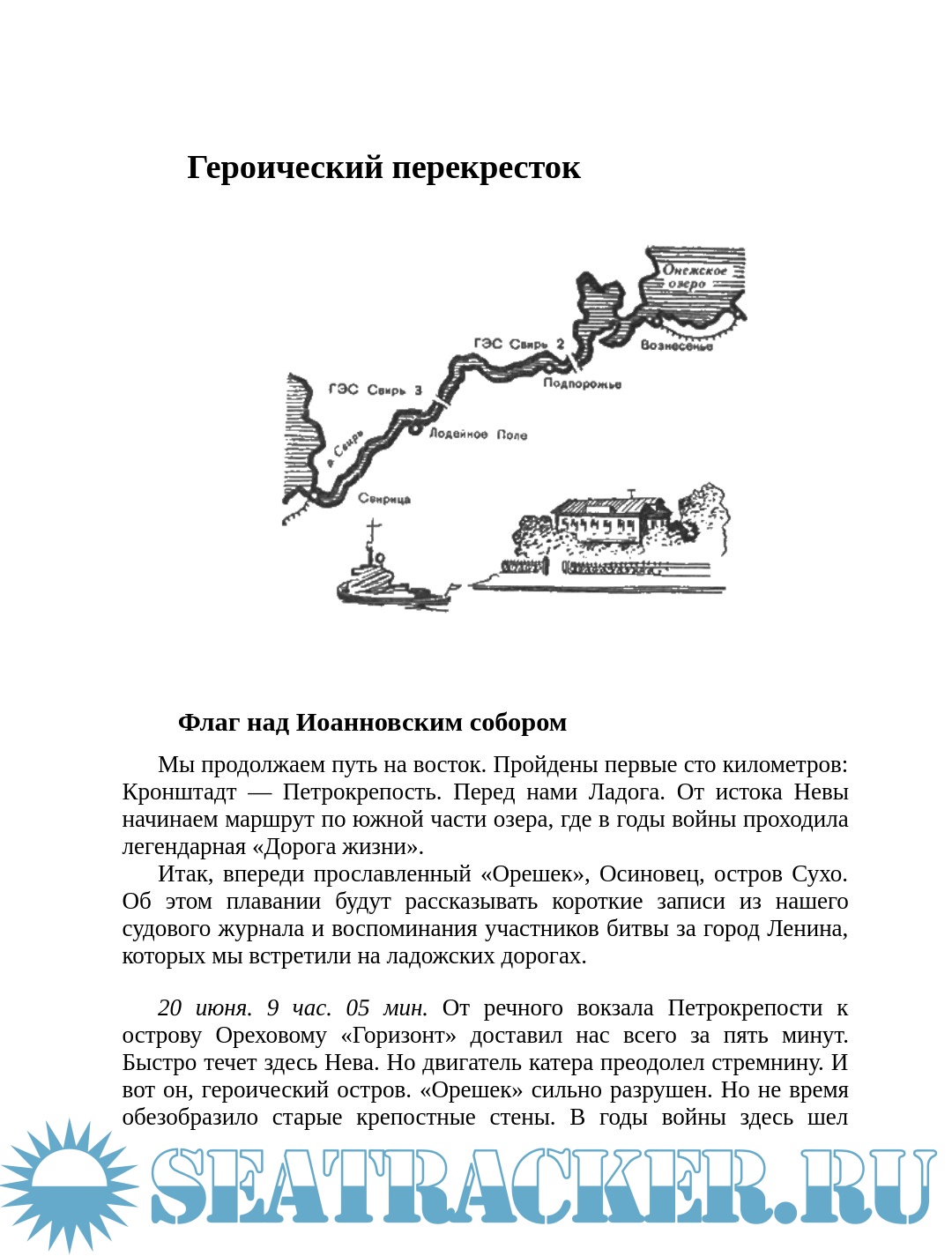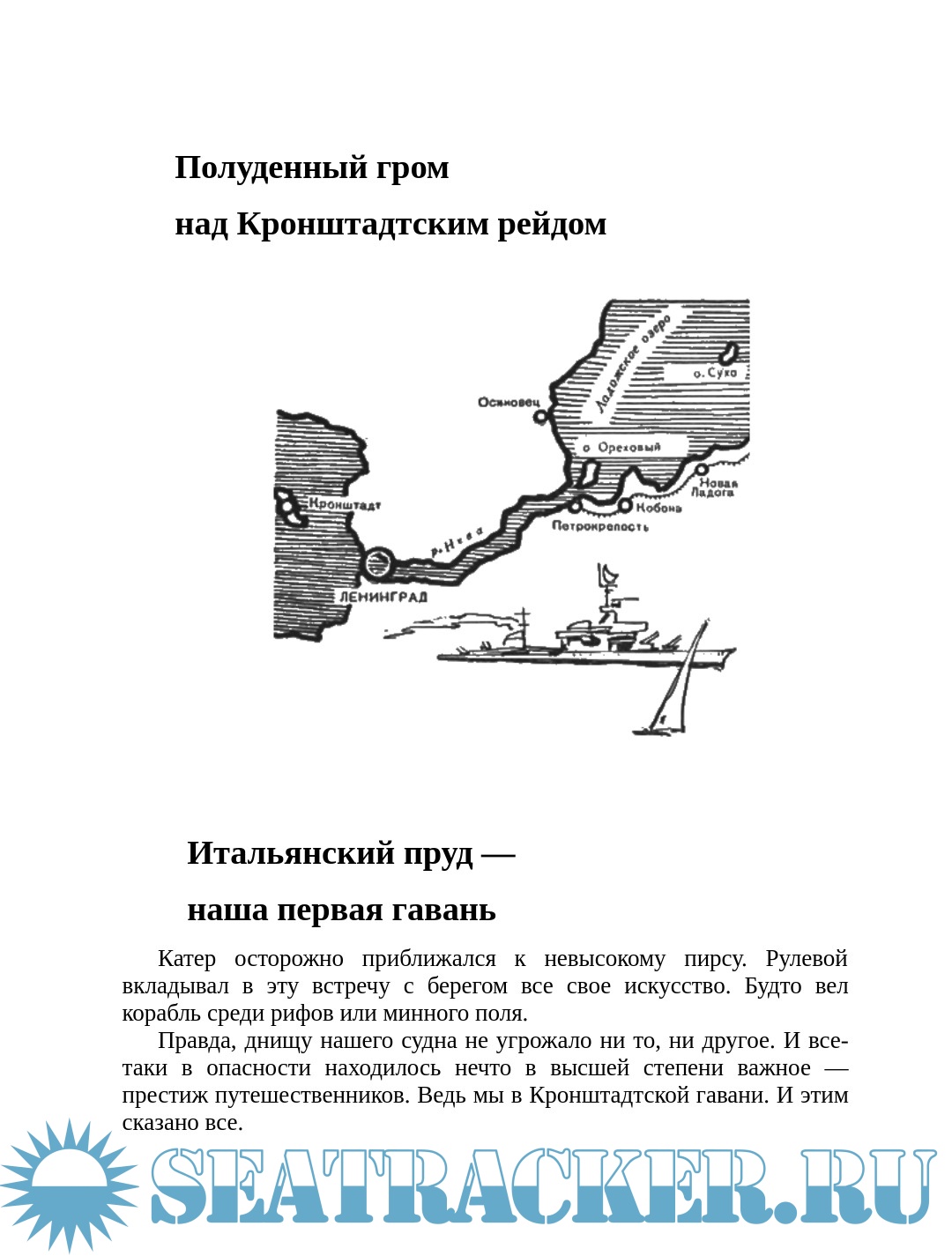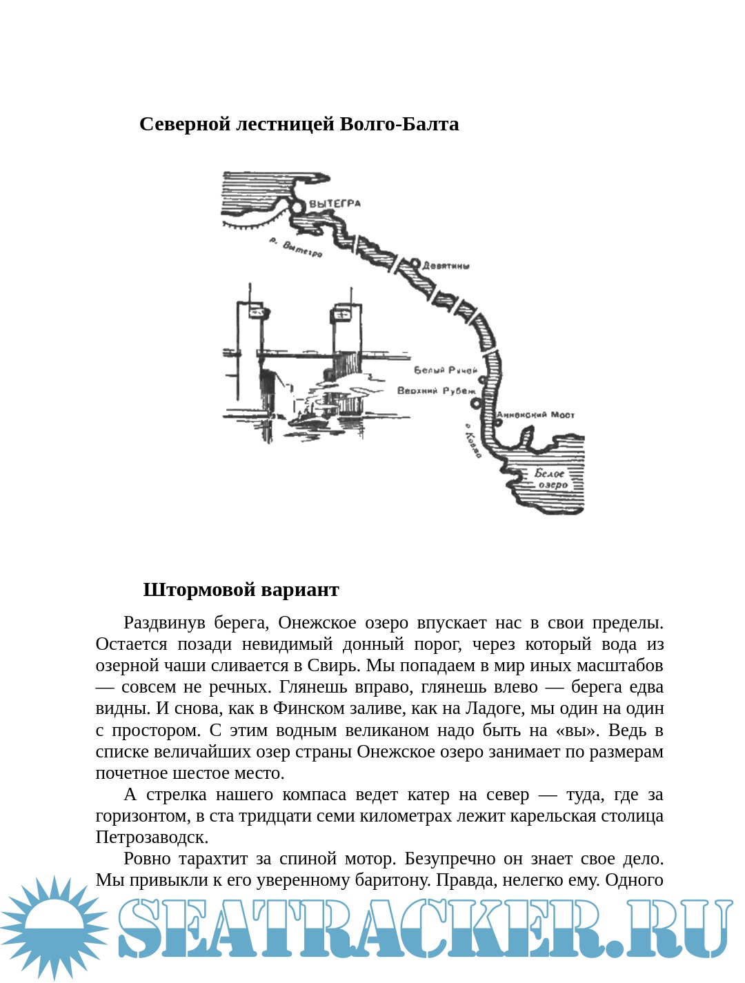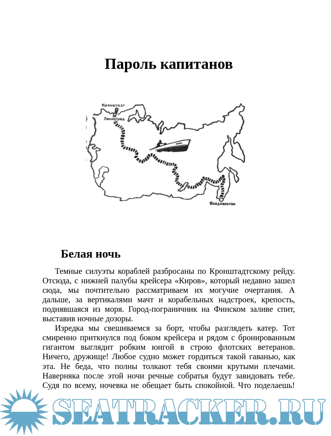 Пароль капитанов Белая ночь Карта из матросского рундучка Голубая нить в 14 000 километров В кабинете министра На горизонте — Кронштадт Полуденный гром над Кронштадтским рейдом Итальянский пруд — наша первая гавань Парад балтийских героев На борту прославленного крейсера Честь флага Флотский порядок Главный фарватер «Маркизовой лужи» Героический перекресток Флаг над Иоанновским собором Вечный огонь маяка 135 минут из биографии острова Ладожские ихтиандры Северной лестницей Волго-Балта Штормовой вариант От прошлого до будущего 100 шагов Гидротехническая операция необходима Музейный шлюз Анхимовская легенда Привратник водного дворца Стрелы кранов над «Вытегорской Швейцарией» Шестой бастион К водораздельному гребню Командир землеройного флагмана Разлилось рукотворное море Последние дни святой Анны Пиррова победа Что там — в Топорнинском «переулке»? Шексна играет волной Навигацию открывают водолазы Строки из Программы Три фута под килем Течет Волга Расплата за самонадеянность Большой день Достоин ли бурлак памятника? Чужая беда Западня Какая лодка нужна путешественнику? Безмятежная вахта Бакенщик изучает электронику У колыбели речных исполинов В нашем полку прибыло Мечта автоиспытателя Здравствуй, берег! Впереди — шторм Урок судовождения Лесоруб не рубит, сплавщик не сплавляет Где же город Елабуга? Уральская помощница На длинном зажигании 3801-й километр Иллюстрации
