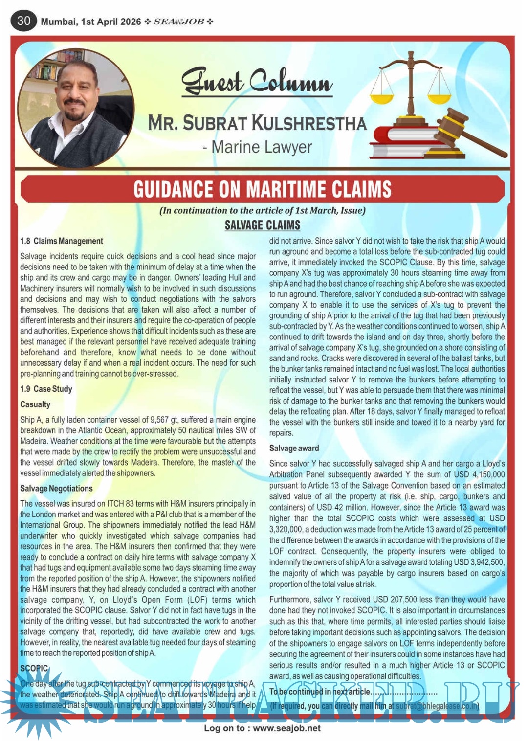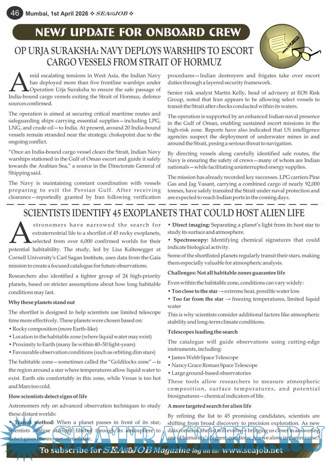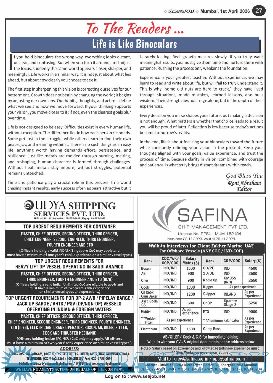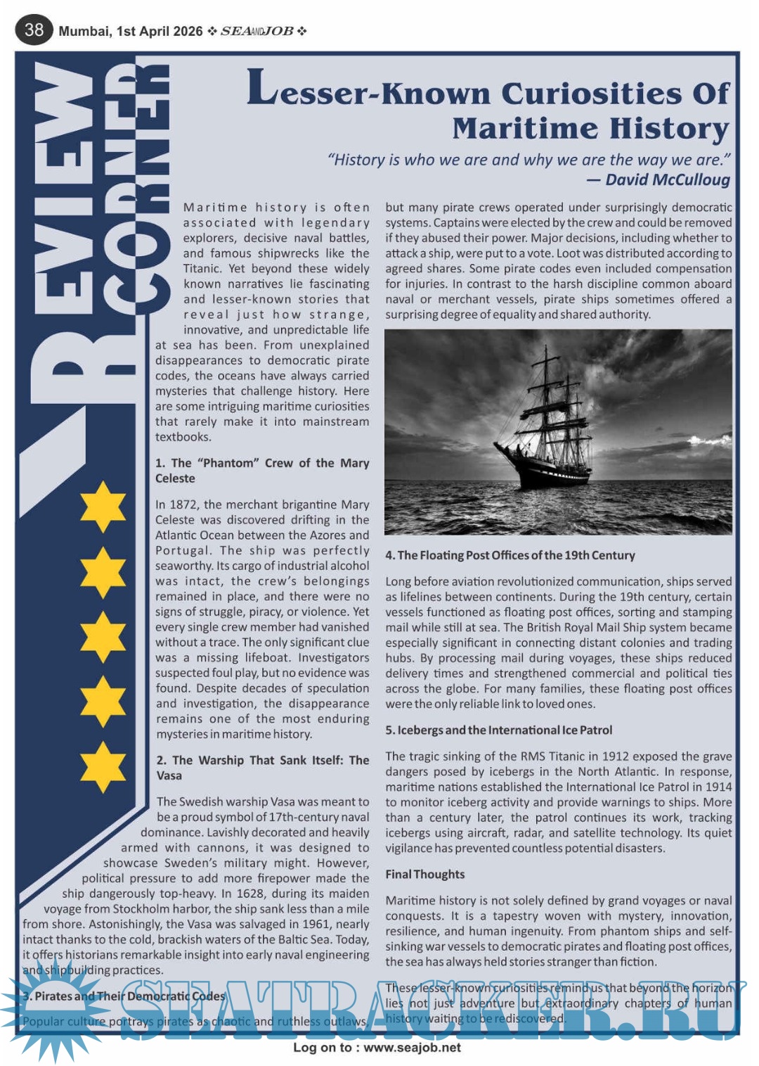 Description: The Sea and Job magazine launched in May 2007, was the second venture of Sea Line Group succeeding 'seajob.net' bringing the much renowned essence to the Group, the Sea and Job Magazine quickly gained popularity, becoming the No. 1 Shipping Magazine that came to be widely circulated all over India.Sea and Job over the years has evolved as the most trusted, ethical, objective and read maritime publication that possesses a large database of subscribers from various verticals in the industry.The magazine provides informative and interesting articles covering not just the shipping world but also the world outside it. Sea and Job is also a medium for the shipping/ manning companies to advertise marine jobs and also to promote their organization by publicizing internal activities like seminars, sports events and parties.Some notable endeavors of the magazine include the Know Your Recruiter Column, the Sailing Episodes Column and the Marine Insights section. The consistent efforts and the dedication to provide extraordinary services to the industry has resulted in the magnifying popularity and patronage of Sea and Job