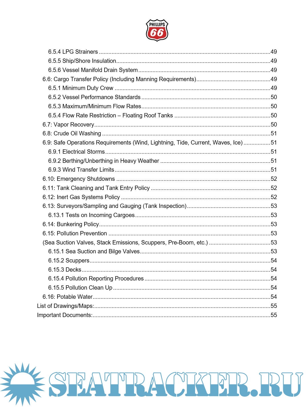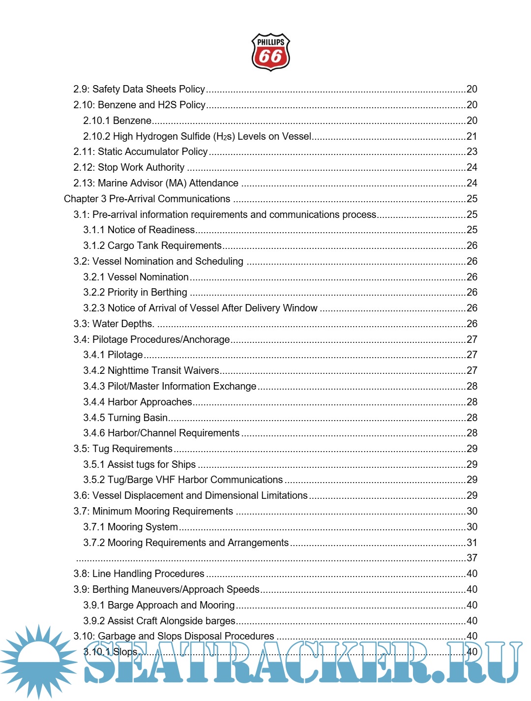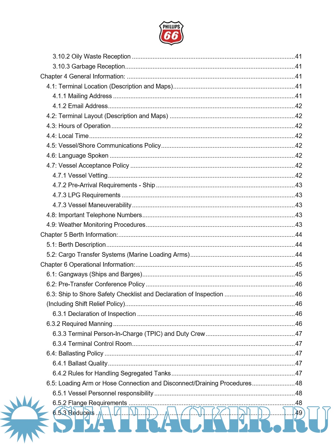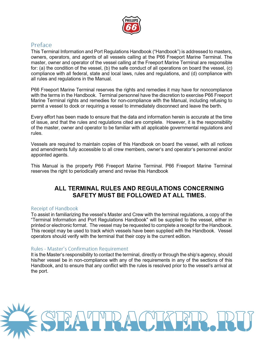 Description: This Terminal Information and Port Regulations Handbook is addressed to masters, owners, operators, and agents of all vessels calling at the P66 Freeport Marine Terminal. The master, owner and operator of the vessel calling at the Freeport Marine Terminal are responsible for: (a) the condition of the vessel, (b) the safe conduct of all operations on board the vessel, (c) compliance with all federal, state and local laws, rules and regulations, and (d) compliance with all rules and regulations in the Manual.