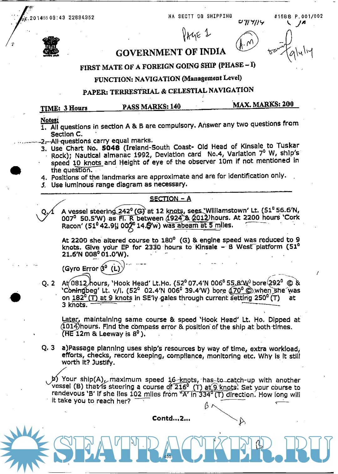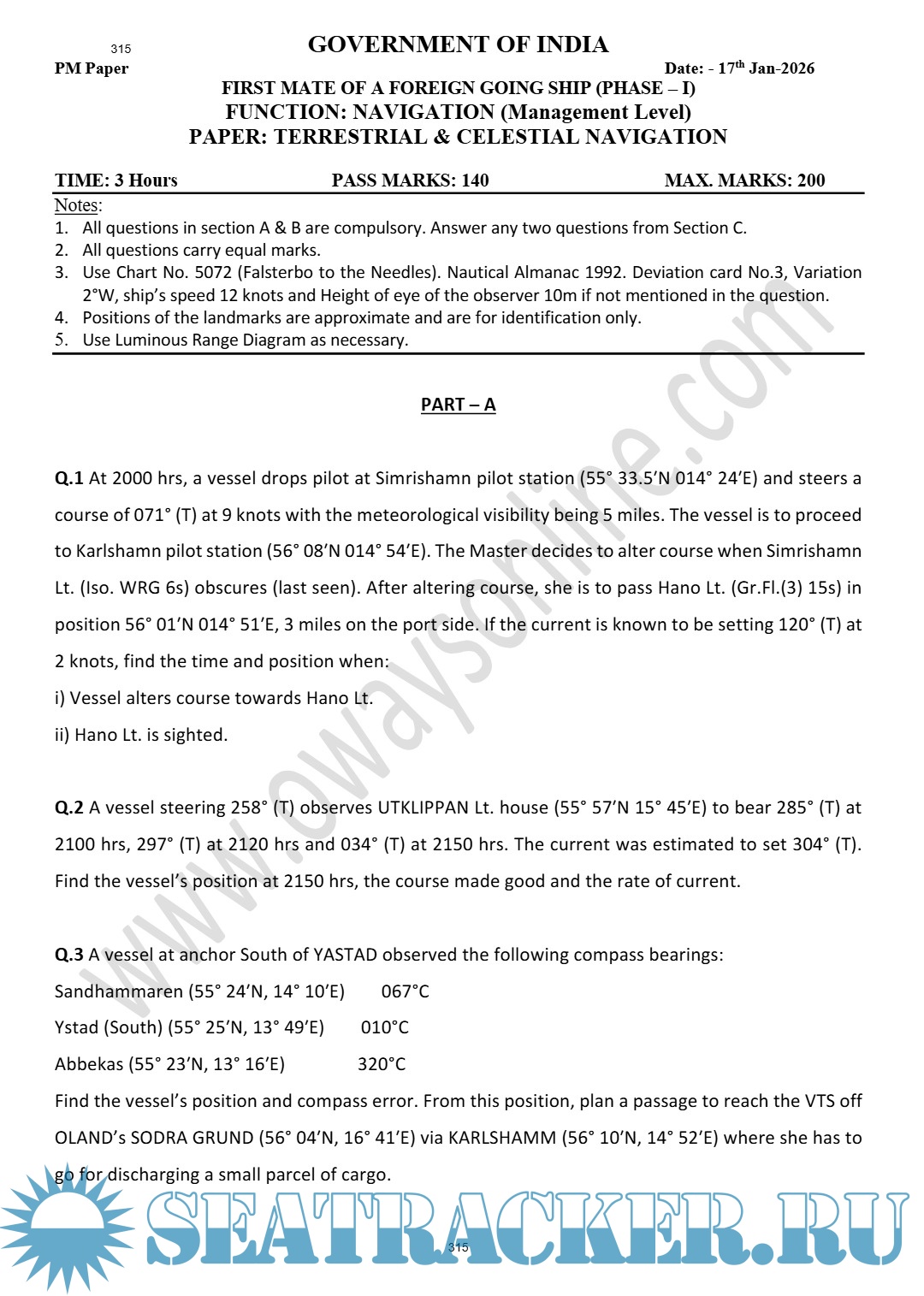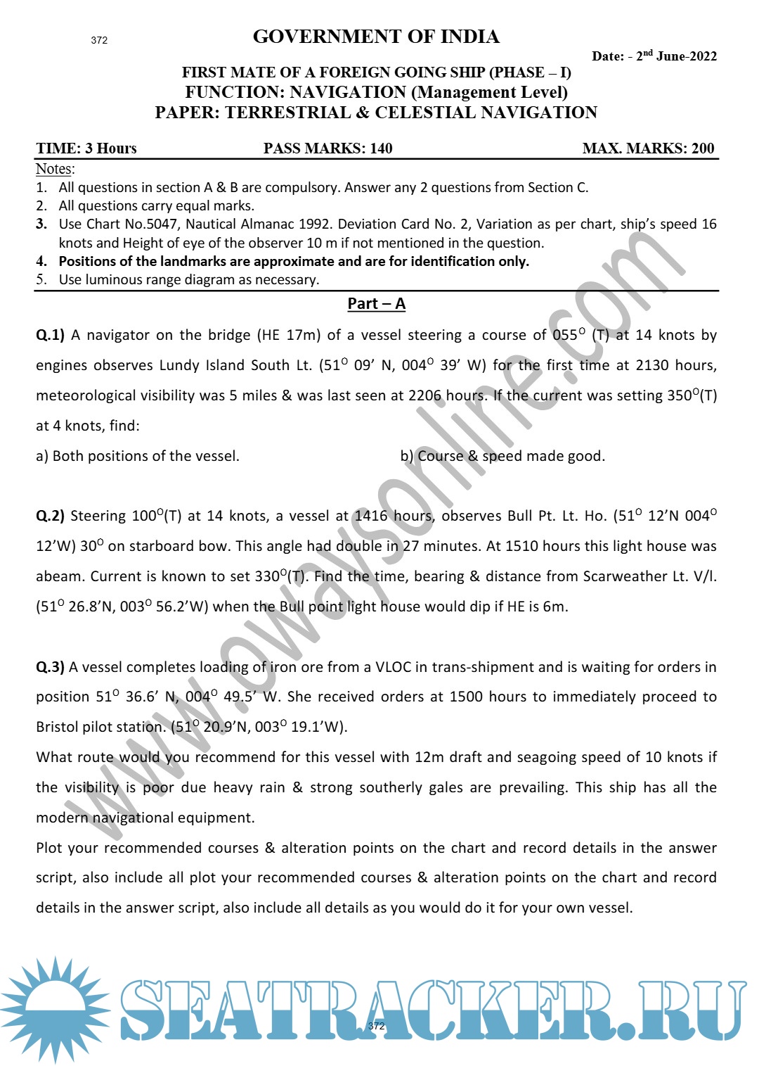 Question Paper Set for Terrestrial and Celestial Navigation (July 2022) for Phase I (Chief Mate…