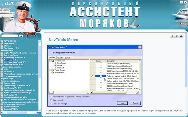 NavTools Meteo - Маленькая и простая в использовании программа для извлечения погодных графиков по всему миру, изображения со спутника, радара и информацию об ураганах из Интернета. NavTools Meteo использует ftp для загрузки данных с большинства погодных серверов, что предоставляет более быструю и более эффективную закачку, чем с вашего веб браузера. Если у вас нет в наличие прямого tcp/ip онлайн подключения, то эти файлы могут быть заказаны по электронной почте