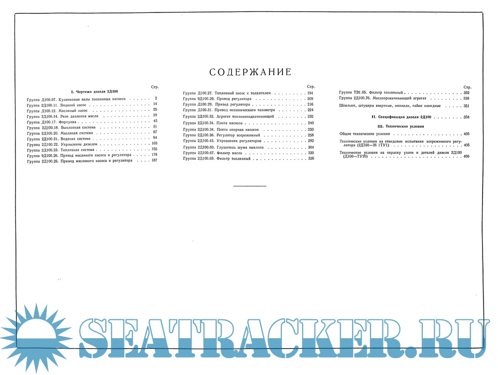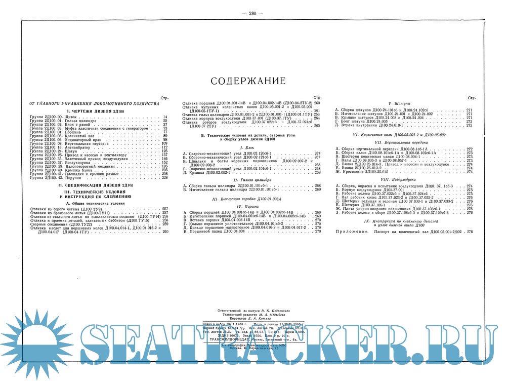 Кроме чертежей, в альбом включены: сводная спецификация дизеля, технические условия на изготовление, сборку, приемку и испытание, а также инструкция по клеймению отдельных узлов и деталей дизеля, помещенных в настоящем альбоме.