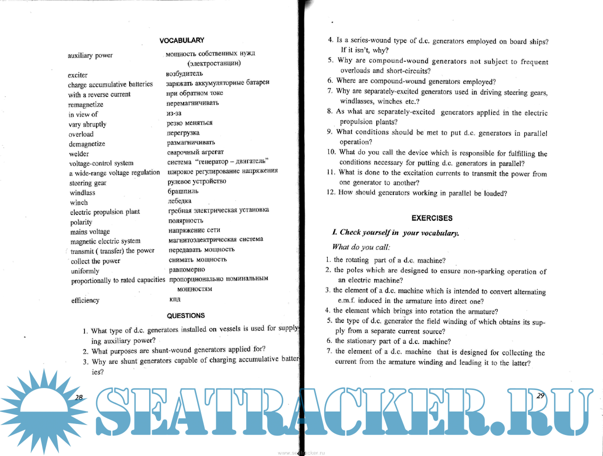 Английский язык судовой электроэнергетики для моряков / English of marine electrical and power engineering for seamen Год выпуска: 2000 Язык: русский Автор: Н.Л.Труханова, Н.А.Кравченко Жанр: Учебное пособие Издательство: Одесса ЛАТСТАР 2000 ISBN: 966-7553-40-x Формат: DOC/PDF Качество: OCR без ошибок/Скан Количество страниц: 167 Описание: Настоящее учебное пособие предназначено для изучения английского языка в области судовой электроэнергетики. Предназначено для студентов старших курсов энергетических факультетов морских учебных заведений, а также для судовых механиков и электромехаников. Рецензенты: проф. Радченко А.П., зав. кафедрой основ судовой электроэнергетики ОГМА; доц. Григорян Н.Р., зав. кафедрой экспериментальной и прикладной фонетики английского языка факультета романо-германской филологии ОГУ им. И.И.Мечникова. Рекомендовано в качестве учебного пособия Ученым советом ОГМА. ПРЕДИСЛОВИЕ Настоящее учебное пособие имеет своей целью обучение специальному английскому морскому языку в области электротехники и предназначено как для студентов старших курсов энергетических факультетов высших мореходных учебных заведений, так и для судовых электромехаников и механиков, желающих усовершенствовать свои знания л области профессионального морского английского языка. Учебное пособие состоит из десяти разделов, в каждом из которых I 4 тематически объединенных текста, сопровождаемых словарем и вопросами. В конце раздела помещены упражнения, способствующие укреплению новой лексики, использованию ее в другом контексте, разит то навыков говорения, а также повторению различных грамматических структур. Следует отметить, что тексты расположены в порядке нарастания уровня сложности, поэтому желательно прорабатывать пособие от начала до конца. Наряду с текстуальным материалом в пособии находится приложения котором представлены изображения основных электрических приборов и инструментов, с которыми часто сталкиваются электромеханики и механики в своей работе, а также их названия на английском и русском языках. Англо-русский словарь, представленный в конце пособия, содержит в себе не только электротехнические термины, но и словосочетания, употребляемые с ними. Сопровождение технических терминов транскрипцией облегчает самостоятельную работу с пособием. Авторы считают своим долгом выразить искреннюю благодарность всем преподавателям кафедры английского языка № 2 ОГМА, особенно доцентам Богомолову О.С. и Никулиной E.JI. за проявленный интерес к работе и се поддержку. Также выражаем признательность профессорам МЛ Скрипнику В.Н. и Радченко А.II. за профессиональную помощь.