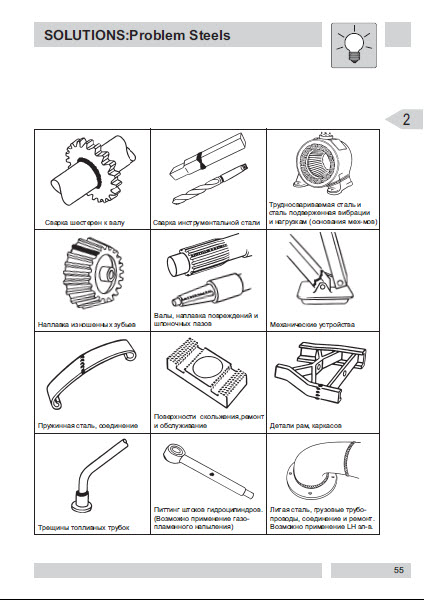 В главе «Решения» представлена таблица кратких ссылок по резке, сварке и восстановлению/покрытию поверхности. В книгу включено описание только того оборудования и расходных